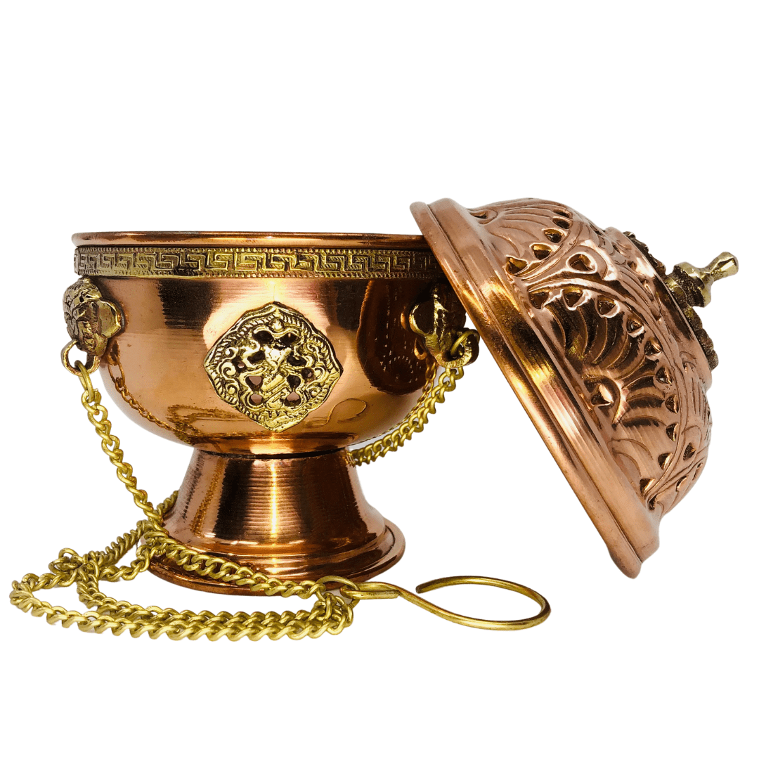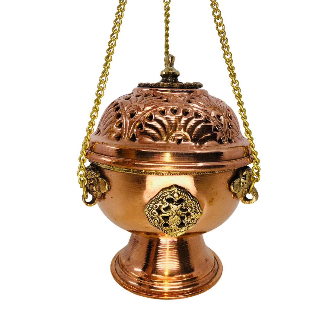 This beautiful copper and brass hanging incense censer is hand crafted in Tibet, and ideal for Ceremonial work. By Consecrating and Purifying the Circle, we define it as Sacred for the work we are there to do during a Ceremony.